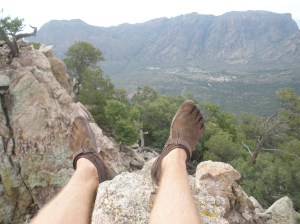 We headed out on the Pinnacles Trail the next morning at around 10am and slowly made our way up and out of the basin, into the High Chisos. The views were spectacular, but climbing 2000′ over four miles with our packs was not. After making it to our first backcountry site in Boot Canyon, we lounged around for a bit and I managed to sneak some reading in. Out of nowhere, hail started coming down, causing us to scurry about to set up camp.